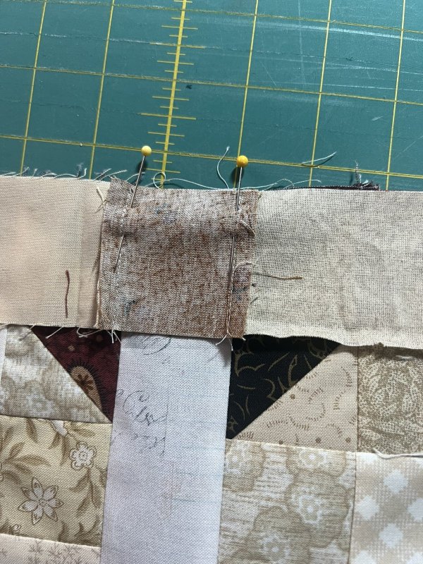 Pinning is very helpful as you add the long sashing strips, and when you are adding each border. You want the dark squares of the sashing to fit perfectly against the cream rectangle. Pin at each of the dark square edges to help your piecing be crisp at these intersections.